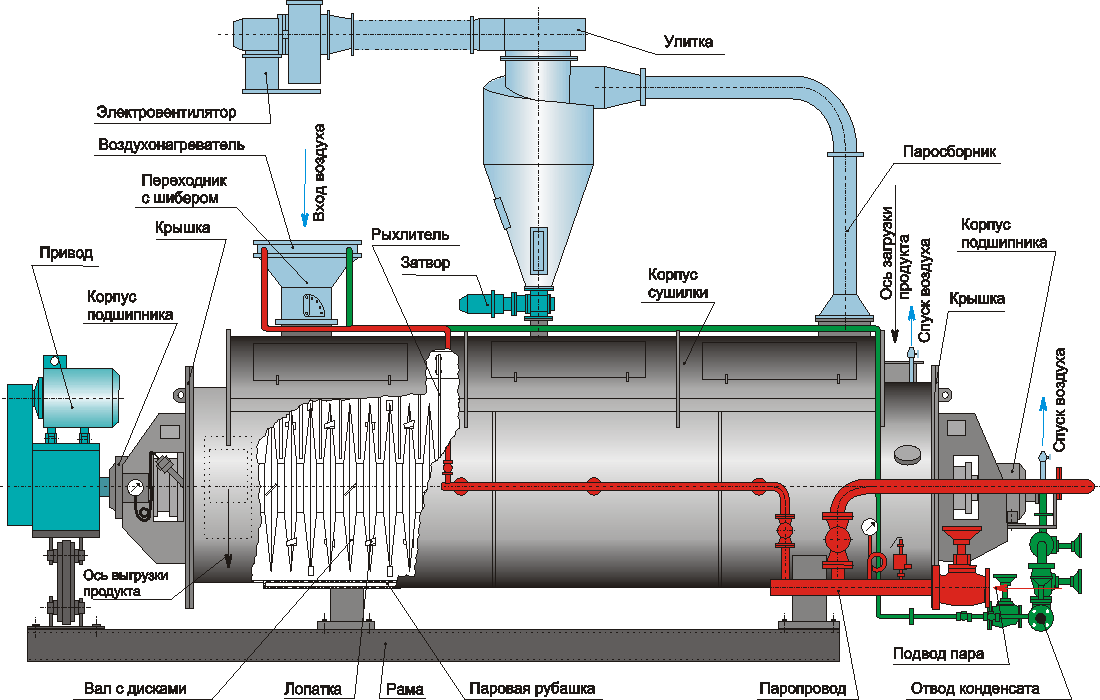 Конструкция сушилок позволяет производить сушку слепливающихся, тяжеловысушиваемых, кашеобразных и сыпучих материалов.