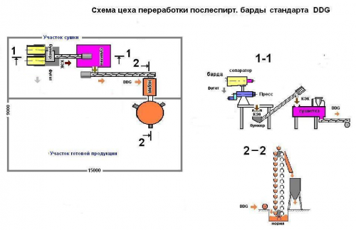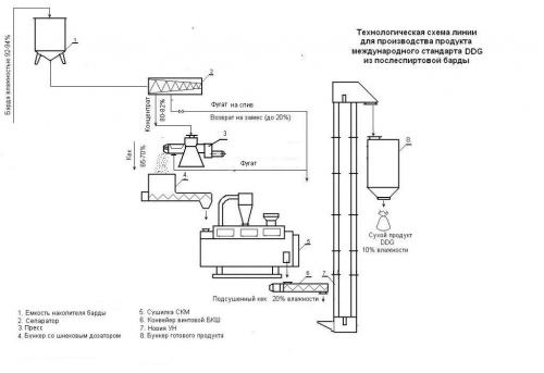 Жидкая барда из отстойника бражной колонны при помощи насоса подается в ёмкость накопителя барды. Затем из ёмкости она самотеком поступает на сепараторы, где предварительно обезвоживается до 80%, после чего попадает в пресса, в которых разделяется на две фазы: одна фаза с низким содержанием твердых веществ (обедненная барда), другая фаза – влажный кек (влажность 65-70%), обогащенный по твердому веществу. После пресса вторая фаза (влажный кек) поступает в накопительный бункер, из которого при помощи шнекового дозатора попадает в сушилку, в которой продукт обезвоживается примерно до 10% остаточной влажности.